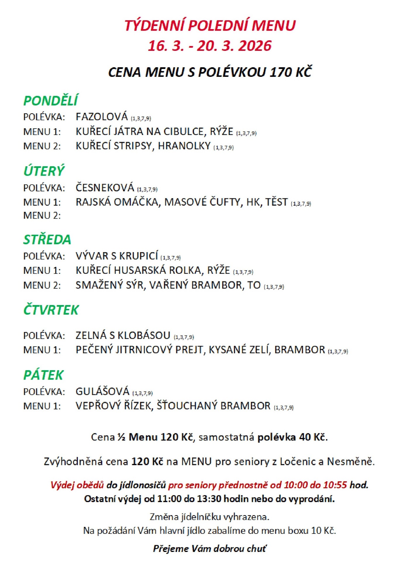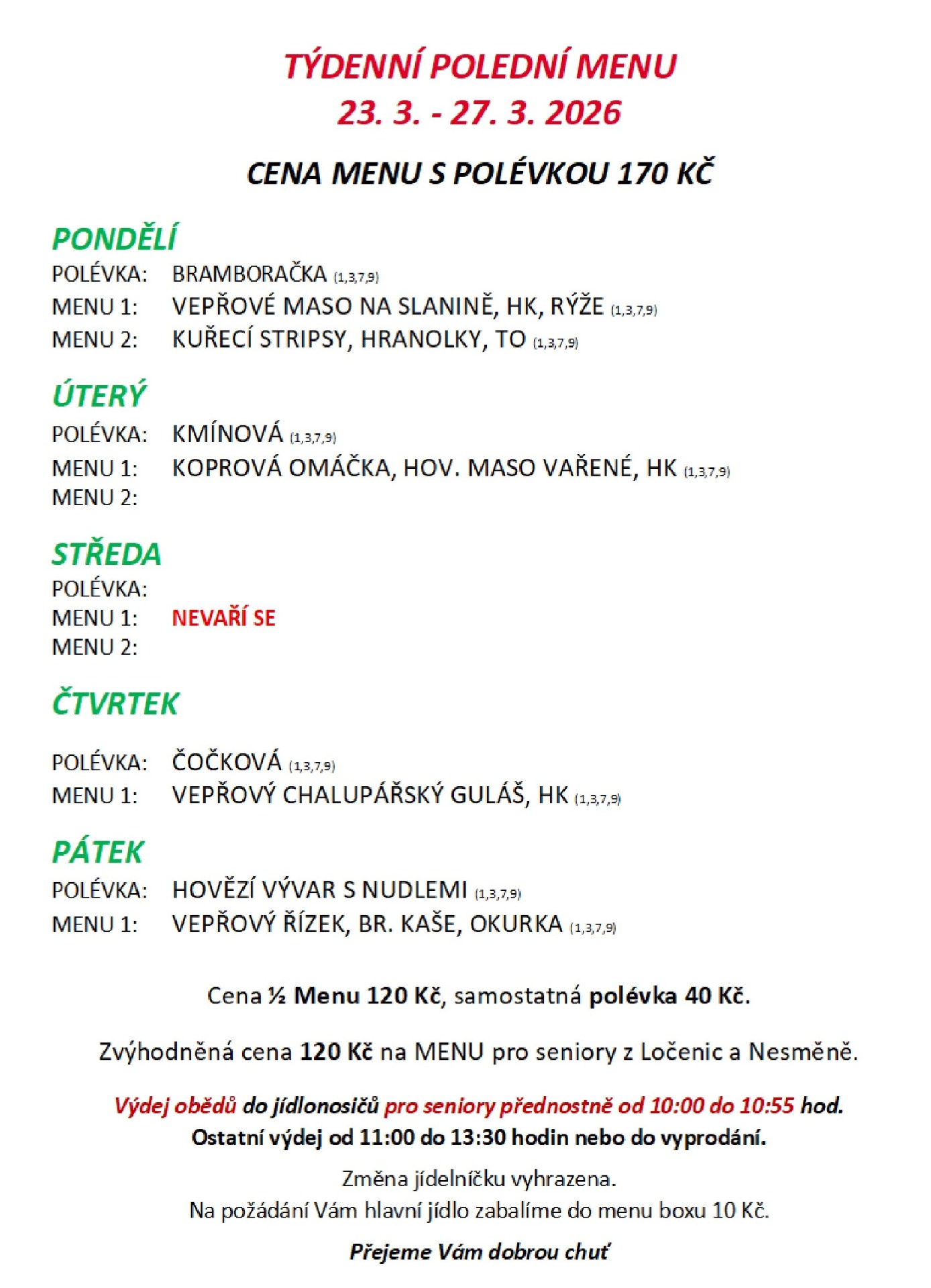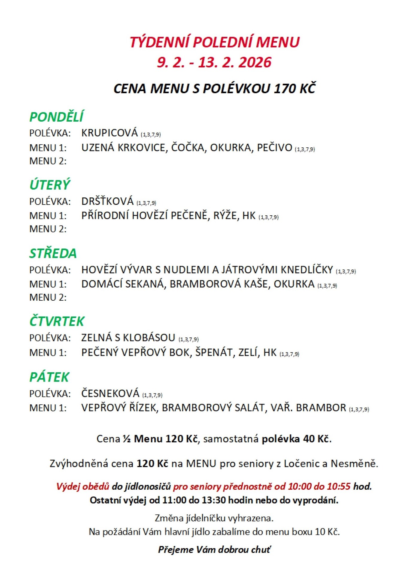 ZDE NAJDETE KAŽDÝ PÁTEK DO 20.00 hod. OBĚDOVÉ MENU NA CELÝ NÁSLEDUJÍCÍ TÝDEN. VÝDEJ BUDE PROBÍHAT OD 10.30 DO 13.30 HODIN NEBO DO VYPRODÁNÍ NAVAŘENÝCH POKRMŮ. CENA MENU, JE VČETNĚ POLÉVKY 170,- Kč, PRO LOČENICKÉ SENIORY 120,-Kč.